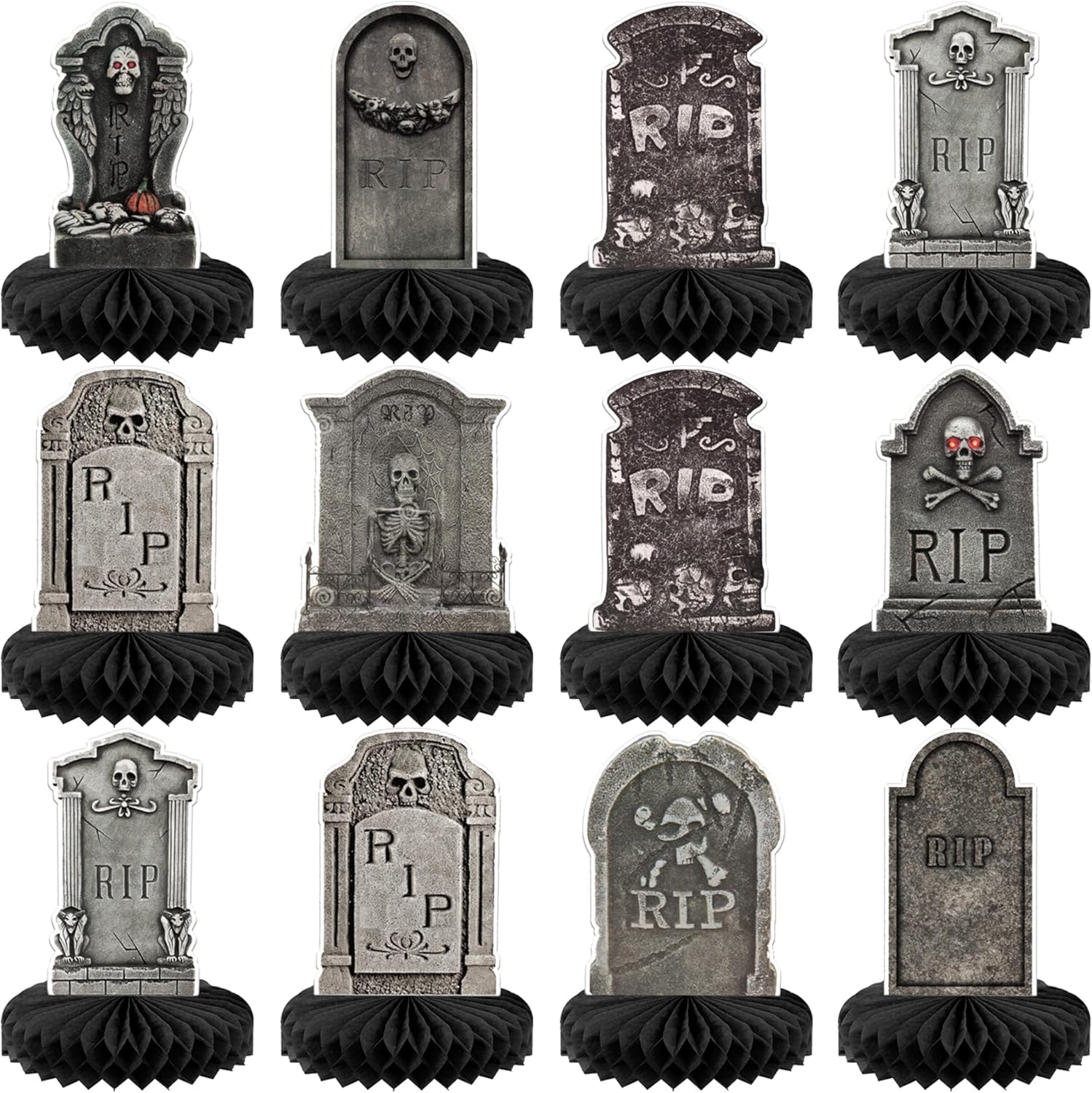 - COMPREHENSIVE PACK OF 12 | EYE-CATCHING DESIGN: Elevate your halloween table centerpieces setup with this pack of 12 halloween honeycomb centerpieces for tables. Each piece features spooky tombstone centerpieces and paper tombstones that instantly transform your space into a haunted graveyard. Perfect for halloween party centerpieces or halloween tombstone decorations, these adorable tombstone table party decor accents create a festive and spooky table atmosphere.