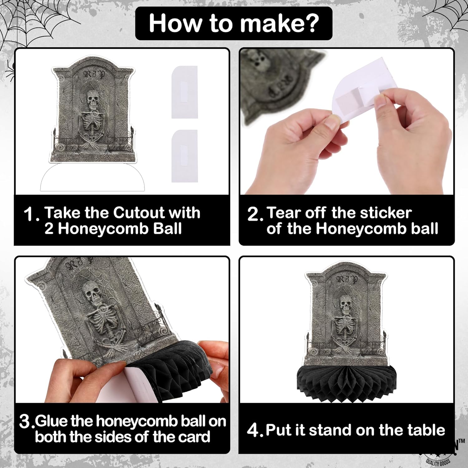 - DOUBLE SIDE PRINTED CENTERPIECES | VARIETY OF DESIGNS: Add eerie charm to your halloween centerpieces for tables with our premium halloween paper centerpieces. These tombstone and skeleton-themed halloween honeycomb centerpieces come in dark, scary colors to enhance your halloween table centerpiece party supplies decorations. Each piece is printed on double-sided cardstock for durability and features multiple tombstone designs that complete your Halloween decor.