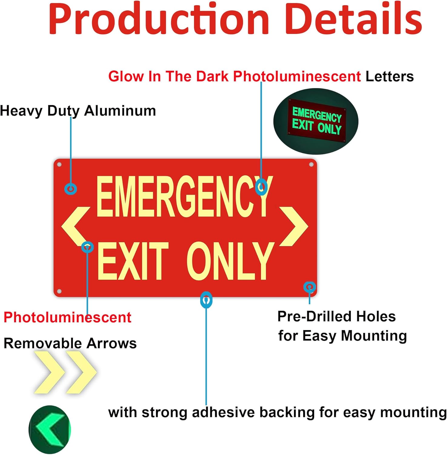(2Pack) Photoluminescent Emergency Exit Sign Red, Glow In The Dark Aluminum Exit Sign - Adhesive Backing - 4pcs Removable Arrows Included - 14.25 x 7.5 Inches - Non Electrical Exit