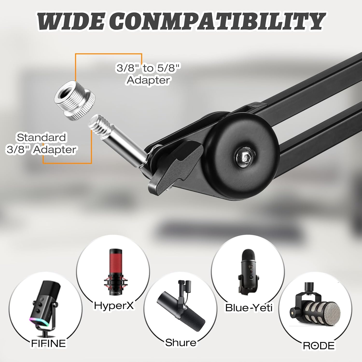 - Universal Compatibility Designed to fit most dynamic and condenser mics, this microphone boom arm comes with a reinforced 3/8" screw, 3/8" to 5/8" adapter, and mic clip. Compatible with Blue Yeti, HyperX QuadCast, Shure SM7B, AT2020, and other popular models. (Shock mount not included)